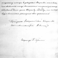 Фрагмент письма, подписаного президентом Новороссийского Общества Естествоиспытателей и секретарём П. Н. Бучинским.В фрагменте упоминается расширение деятельности биологической станции в связи с возможностью построить для неё собственное здание. 28 сентября 1890 г.