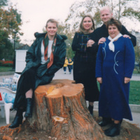 Фото сделано по поводу юбилей одного из сотрудников отдела. 2005 г.У пня упавшего после бури дерева, октябрь 2003 [ID: 1039 ]