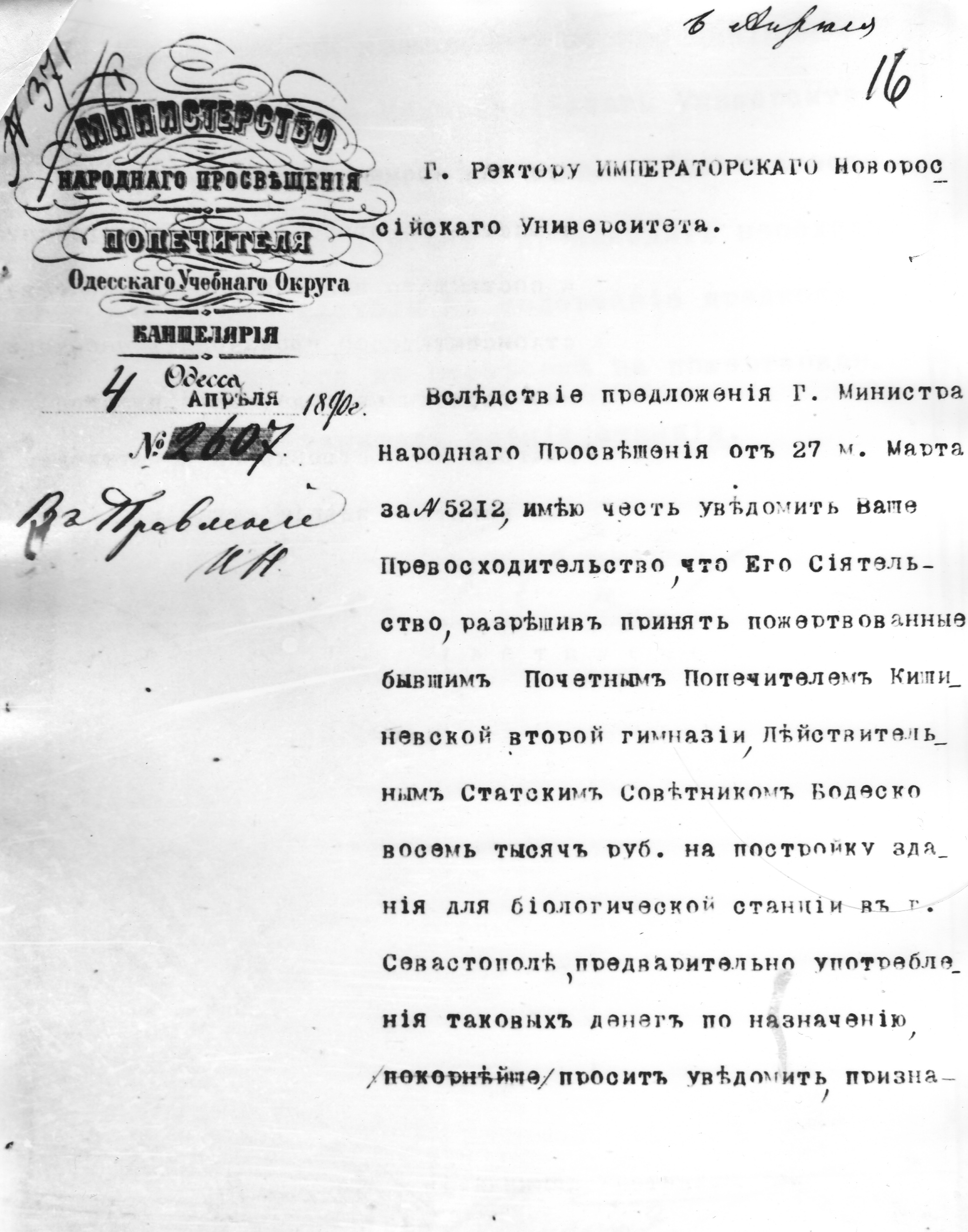 Вследствие предложения Г. Министра Народного Просвещения от 27 марта за №5212, имею честь уведомить Ваше Превосходительство, что Его Сиятельство, разрешив принять пожертвование бывшим Почетным Попечителем Кишиневской второй гимназии, Действительным Статским Советником Бодеско восемь тысяч руб. на постройку здания для биологической станции в г. Севастополе, предварительно употребления таких денег по назначению /покорнейше/ просит уведомить, признается ли возможность, по состоянию средств Новороссийского Университета и состоящего при оном Общества естествоиспытателей, производить необходимые расходы на содержание предполагающегося к постройке на пожертвованный капитал здания станции.