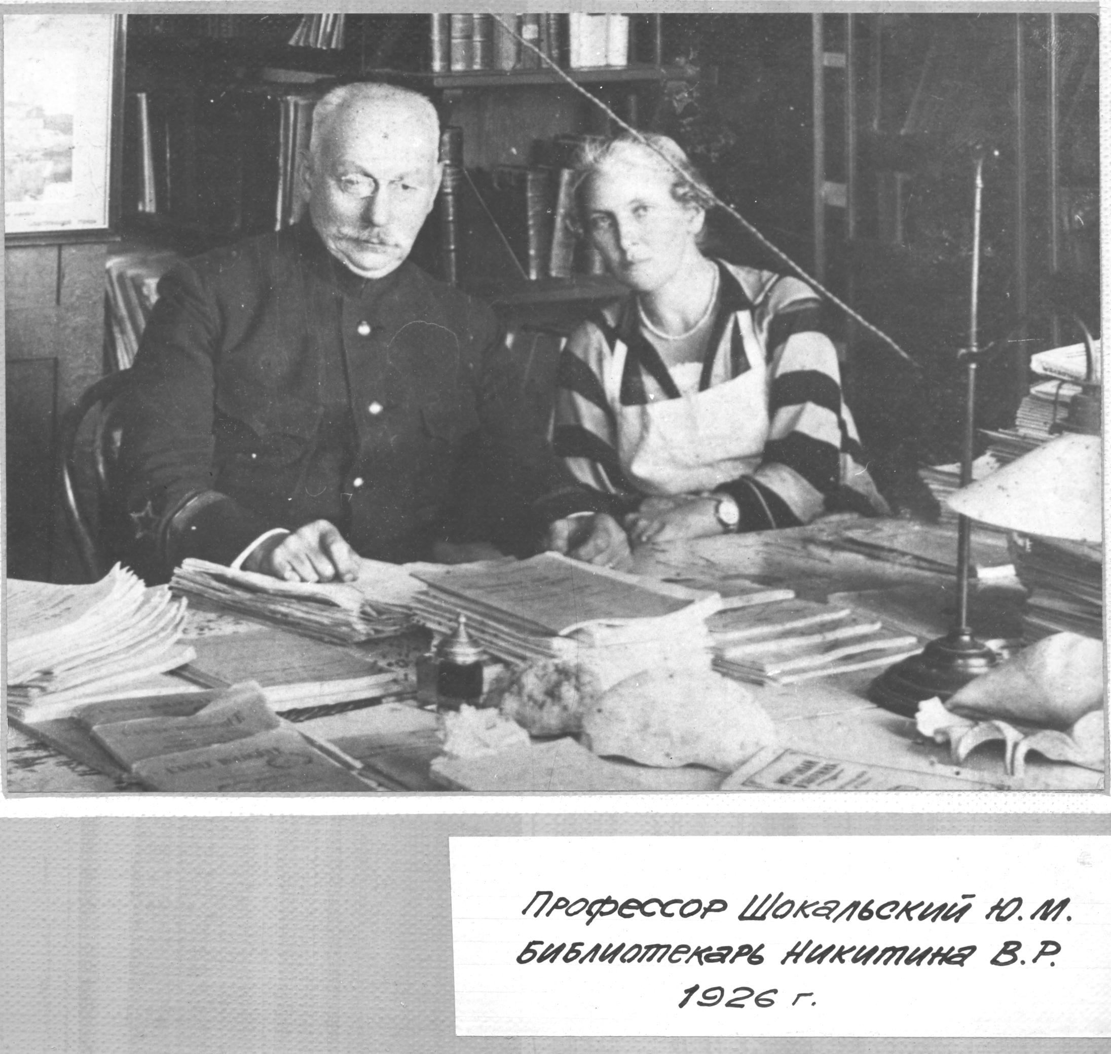 Профессор Шокальский Ю. М. и библиотекарь Никитина В. Р., 1926 г.